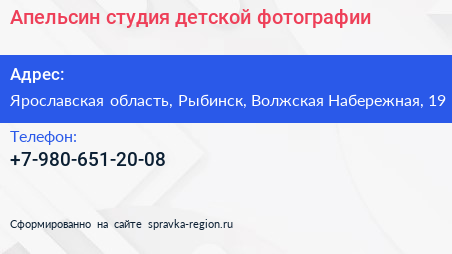 Апельсин, студия детской фотографии по адресу Ярославская область, Рыбинск, Волжская Набережная, 19 в дальнейшем Организация, размещена в следующих категориях: