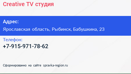 Creative.TV, студия по адресу Ярославская область, Рыбинск, Бабушкина, 23 в дальнейшем Организация, размещена в следующих категориях: