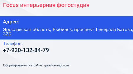 Focus, интерьерная фотостудия по адресу Ярославская область, Рыбинск, проспект Генерала Батова, 32Б в дальнейшем Организация, размещена в следующих категориях: