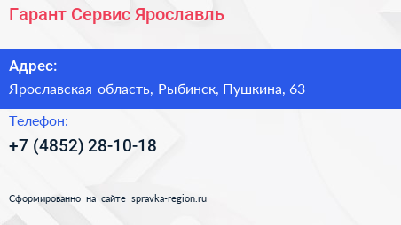 Гарант Сервис Ярославль по адресу Ярославская область, Рыбинск, Пушкина, 63 в дальнейшем Организация, размещена в следующих категориях: