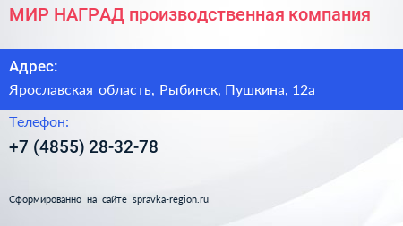 МИР НАГРАД, производственная компания по адресу Ярославская область, Рыбинск, Пушкина, 12а в дальнейшем Организация, размещена в следующих категориях: