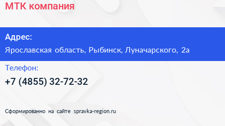 МТК, компания по адресу Ярославская область, Рыбинск, Луначарского, 2а в дальнейшем Организация, размещена в следующих категориях: