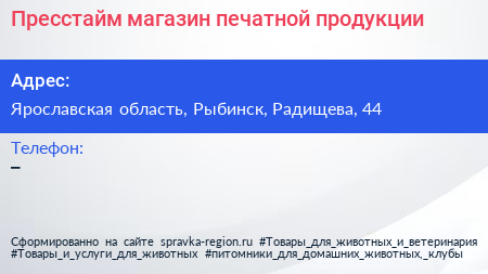 Пресстайм, магазин печатной продукции по адресу Ярославская область, Рыбинск, Радищева, 44 в дальнейшем Организация, размещена в следующих категориях: