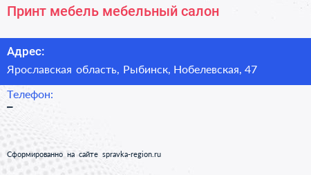 Принт мебель, мебельный салон по адресу Ярославская область, Рыбинск, Нобелевская, 47 в дальнейшем Организация, размещена в следующих категориях: