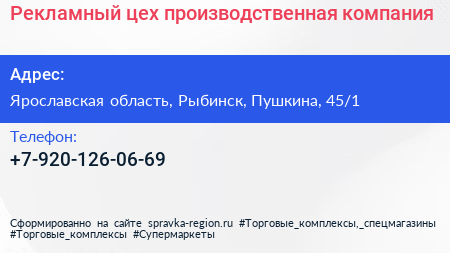 Рекламный цех, производственная компания по адресу Ярославская область, Рыбинск, Пушкина, 45/1 в дальнейшем Организация, размещена в следующих категориях: