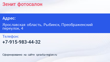 Зенит, фотосалон по адресу Ярославская область, Рыбинск, Преображенский переулок, 4 в дальнейшем Организация, размещена в следующих категориях:
