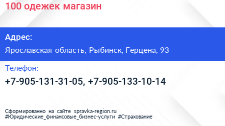 100 одежек, магазин по адресу Ярославская область, Рыбинск, Герцена, 93 в дальнейшем Организация, размещена в следующих категориях: