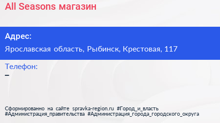 All Seasons, магазин по адресу Ярославская область, Рыбинск, Крестовая, 117 в дальнейшем Организация, размещена в следующих категориях:
