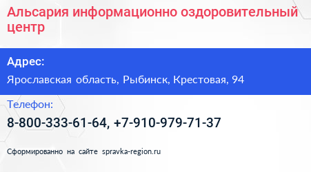Альсария, информационно-оздоровительный центр по адресу Ярославская область, Рыбинск, Крестовая, 94 в дальнейшем Организация, размещена в следующих категориях:
