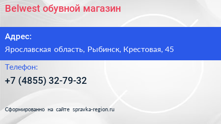 Belwest, обувной магазин по адресу Ярославская область, Рыбинск, Крестовая, 45 в дальнейшем Организация, размещена в следующих категориях: