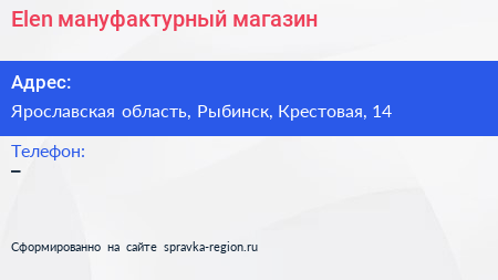 Elen, мануфактурный магазин по адресу Ярославская область, Рыбинск, Крестовая, 14 в дальнейшем Организация, размещена в следующих категориях: