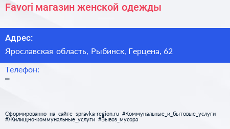 Favori, магазин женской одежды по адресу Ярославская область, Рыбинск, Герцена, 62 в дальнейшем Организация, размещена в следующих категориях: