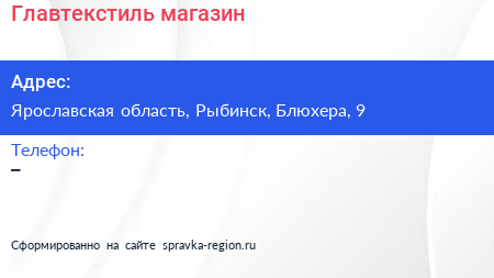 Главтекстиль, магазин по адресу Ярославская область, Рыбинск, Блюхера, 9 в дальнейшем Организация, размещена в следующих категориях: