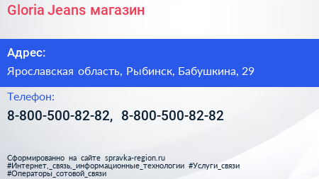 Gloria Jeans, магазин по адресу Ярославская область, Рыбинск, Бабушкина, 29 в дальнейшем Организация, размещена в следующих категориях: