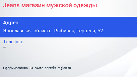 Jeans, магазин мужской одежды по адресу Ярославская область, Рыбинск, Герцена, 62 в дальнейшем Организация, размещена в следующих категориях: