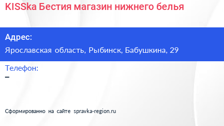 KISSka Бестия, магазин нижнего белья по адресу Ярославская область, Рыбинск, Бабушкина, 29 в дальнейшем Организация, размещена в следующих категориях: