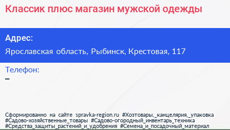 Классик плюс, магазин мужской одежды по адресу Ярославская область, Рыбинск, Крестовая, 117 в дальнейшем Организация, размещена в следующих категориях: