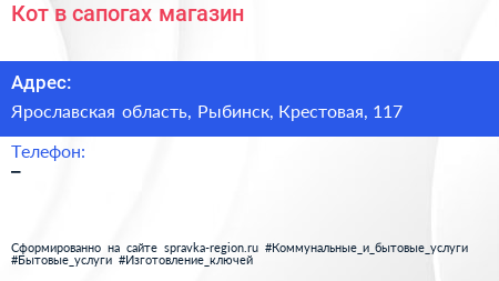 Кот в сапогах, магазин по адресу Ярославская область, Рыбинск, Крестовая, 117 в дальнейшем Организация, размещена в следующих категориях: