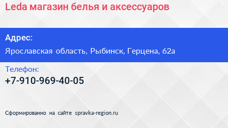 Leda, магазин белья и аксессуаров по адресу Ярославская область, Рыбинск, Герцена, 62а в дальнейшем Организация, размещена в следующих категориях: