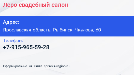 Леро, свадебный салон по адресу Ярославская область, Рыбинск, Чкалова, 60 в дальнейшем Организация, размещена в следующих категориях: