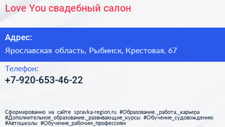 Love You, свадебный салон по адресу Ярославская область, Рыбинск, Крестовая, 67 в дальнейшем Организация, размещена в следующих категориях: