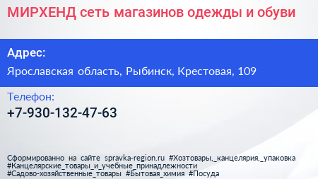 МИРХЕНД, сеть магазинов одежды и обуви по адресу Ярославская область, Рыбинск, Крестовая, 109 в дальнейшем Организация, размещена в следующих категориях: