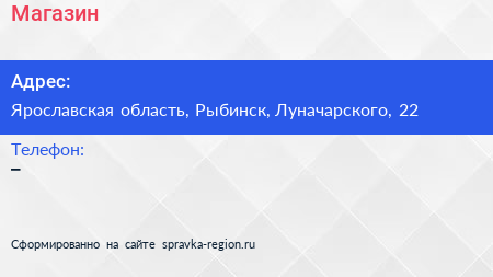 Магазин по адресу Ярославская область, Рыбинск, Луначарского, 22 в дальнейшем Организация, размещена в следующих категориях: