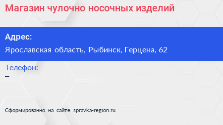 Магазин чулочно-носочных изделий по адресу Ярославская область, Рыбинск, Герцена, 62 в дальнейшем Организация, размещена в следующих категориях: