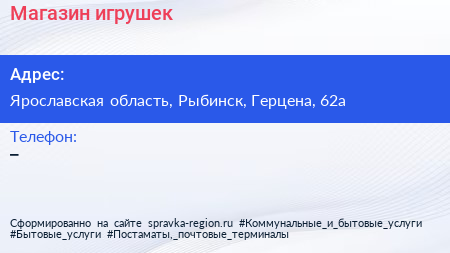 Магазин игрушек по адресу Ярославская область, Рыбинск, Герцена, 62а в дальнейшем Организация, размещена в следующих категориях: