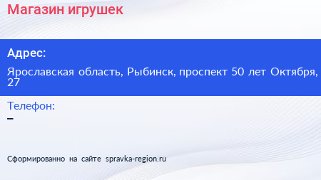 Магазин игрушек по адресу Ярославская область, Рыбинск, проспект 50 лет Октября, 27 в дальнейшем Организация, размещена в следующих категориях: