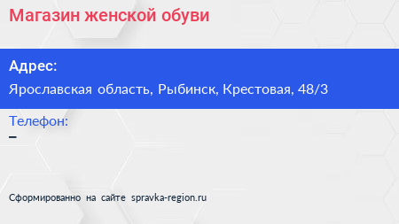 Магазин женской обуви по адресу Ярославская область, Рыбинск, Крестовая, 48/3 в дальнейшем Организация, размещена в следующих категориях: