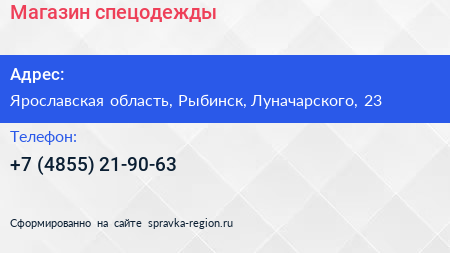 Магазин спецодежды по адресу Ярославская область, Рыбинск, Луначарского, 23 в дальнейшем Организация, размещена в следующих категориях: