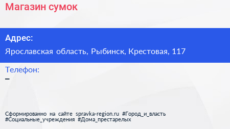 Магазин сумок по адресу Ярославская область, Рыбинск, Крестовая, 117 в дальнейшем Организация, размещена в следующих категориях: