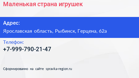Маленькая страна игрушек по адресу Ярославская область, Рыбинск, Герцена, 62а в дальнейшем Организация, размещена в следующих категориях: