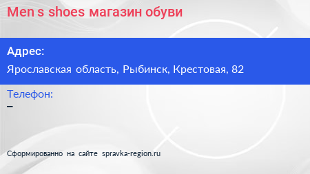 Men`s shoes, магазин обуви по адресу Ярославская область, Рыбинск, Крестовая, 82 в дальнейшем Организация, размещена в следующих категориях: