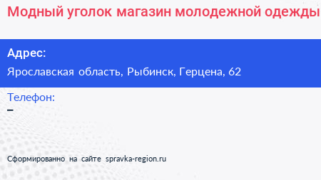 Модный уголок, магазин молодежной одежды по адресу Ярославская область, Рыбинск, Герцена, 62 в дальнейшем Организация, размещена в следующих категориях: