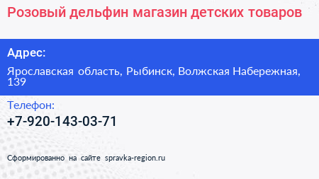 Розовый дельфин, магазин детских товаров по адресу Ярославская область, Рыбинск, Волжская Набережная, 139 в дальнейшем Организация, размещена в следующих категориях:
