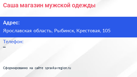 Саша, магазин мужской одежды по адресу Ярославская область, Рыбинск, Крестовая, 105 в дальнейшем Организация, размещена в следующих категориях: