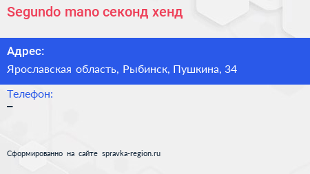 Segundo mano, секонд-хенд по адресу Ярославская область, Рыбинск, Пушкина, 34 в дальнейшем Организация, размещена в следующих категориях:
