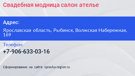 Свадебная модница, салон-ателье по адресу Ярославская область, Рыбинск, Волжская Набережная, 169 в дальнейшем Организация, размещена в следующих категориях: