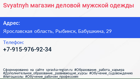 Svyatnyh, магазин деловой мужской одежды по адресу Ярославская область, Рыбинск, Бабушкина, 29 в дальнейшем Организация, размещена в следующих категориях: