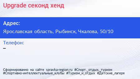 Upgrade, секонд-хенд по адресу Ярославская область, Рыбинск, Чкалова, 50/10 в дальнейшем Организация, размещена в следующих категориях: