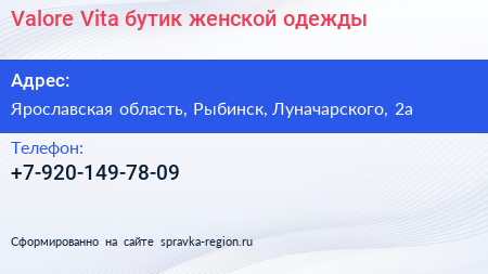 Valore Vita, бутик женской одежды по адресу Ярославская область, Рыбинск, Луначарского, 2а в дальнейшем Организация, размещена в следующих категориях: