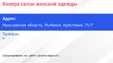 Венера, салон женской одежды по адресу Ярославская область, Рыбинск, Крестовая, 75/7 в дальнейшем Организация, размещена в следующих категориях:
