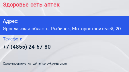 Здоровье, сеть аптек по адресу Ярославская область, Рыбинск, Моторостроителей, 20 в дальнейшем Организация, размещена в следующих категориях: