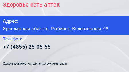 Здоровье, сеть аптек по адресу Ярославская область, Рыбинск, Волочаевская, 49 в дальнейшем Организация, размещена в следующих категориях: