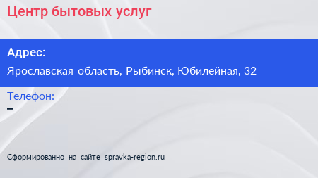 Центр бытовых услуг по адресу Ярославская область, Рыбинск, Юбилейная, 32 в дальнейшем Организация, размещена в следующих категориях: