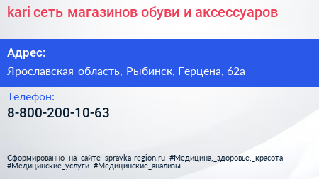 kari, сеть магазинов обуви и аксессуаров по адресу Ярославская область, Рыбинск, Герцена, 62а в дальнейшем Организация, размещена в следующих категориях:
