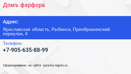 Домъ фарфора по адресу Ярославская область, Рыбинск, Преображенский переулок, 4 в дальнейшем Организация, размещена в следующих категориях: