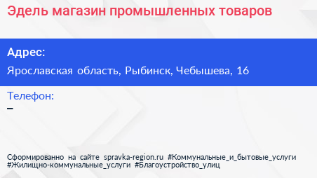 Эдель, магазин промышленных товаров по адресу Ярославская область, Рыбинск, Чебышева, 16 в дальнейшем Организация, размещена в следующих категориях: